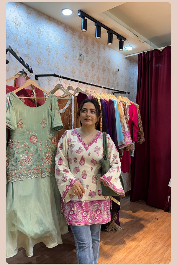 Radiate elegance with theΒ Noorani Cotton Kurti, crafted in soft ivory cotton with vibrant pink floral motifs. The kurti features a V-neckline with contrast border detailing, flared sleeves, and a beautifully patterned paisley border at the hem, adding a traditional yet trendy touch.