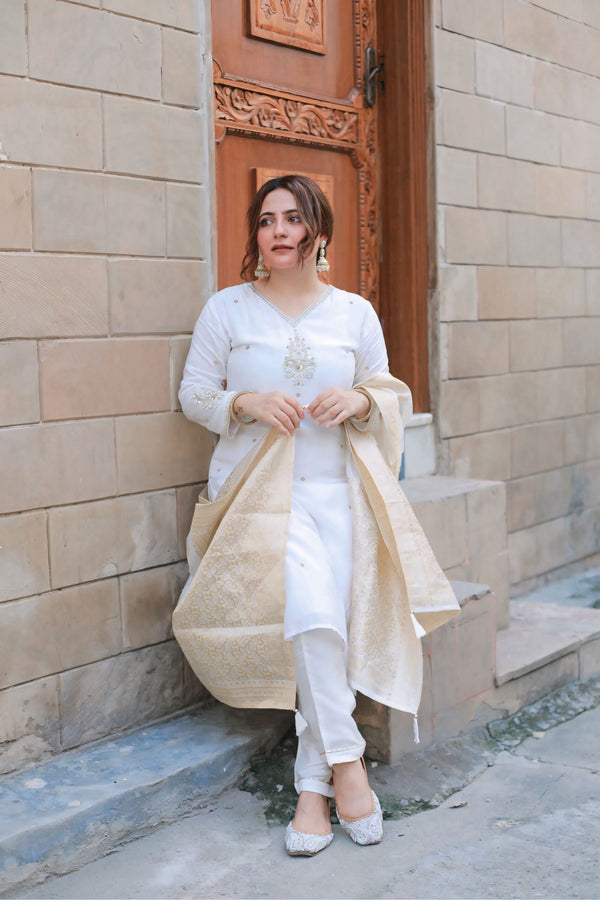 Experience elegance with our Pearl White Pure Silk Suit, featuring intricate handwork. Perfect for special occasions, this suit combines luxury and craftsmanship for a timeless look